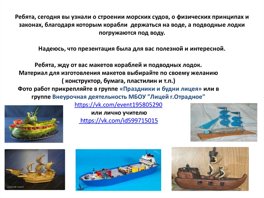 Ребята, жду от вас макетов кораблей и подводных лодок.