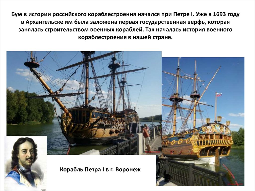 Бум в истории российского кораблестроения начался при Петре I. Уже в 1693 годув Архангельске им была заложена первая государственная верфь, которая