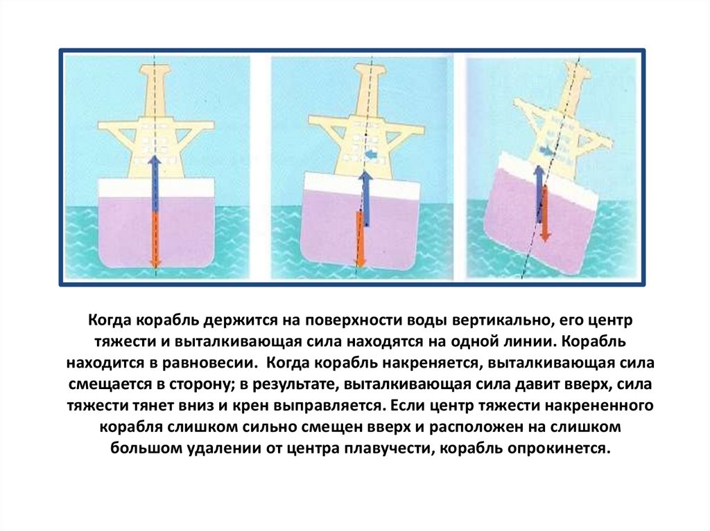 Когда корабль держится на поверхности воды вертикально, его центртяжести и выталкивающая сила находятся на одной линии. Корабль