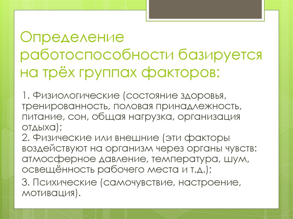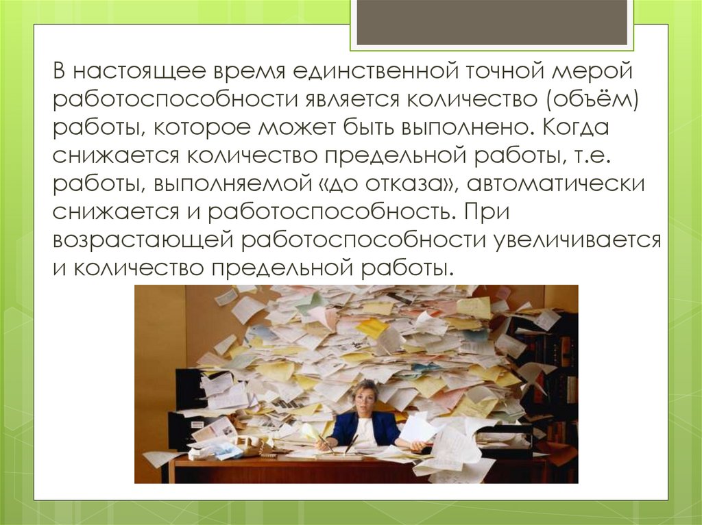 Работоспособность – это способность человека в течениеопределённого времени выполнять определённый род