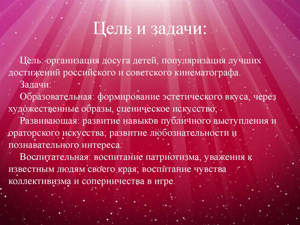 Цель и задачи:Цель: организация досуга детей, популяризация лучших