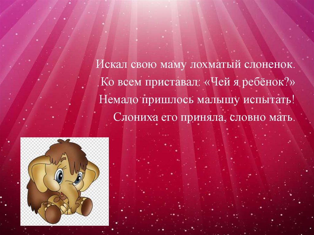Искал свою маму лохматый слоненок.Ко всем приставал: «Чей я ребёнок?»