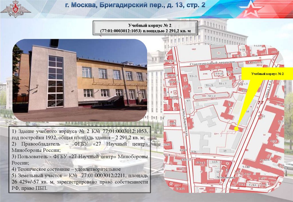 1) Здание учебного корпуса № 2 К№ 77:01:0003012:1053,