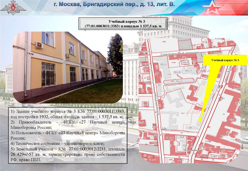 1) Здание учебного корпуса № 3 К№ 77:01:0003011:3383,