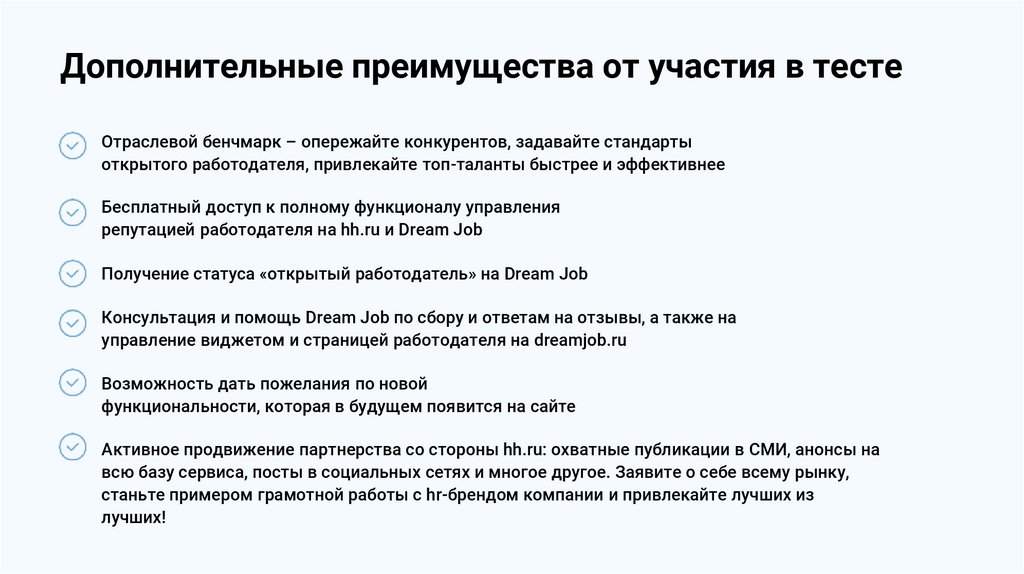 Дополнительные преимущества от участия в тестеОтраслевой бенчмарк – опережайте конкурентов, задавайте стандарты