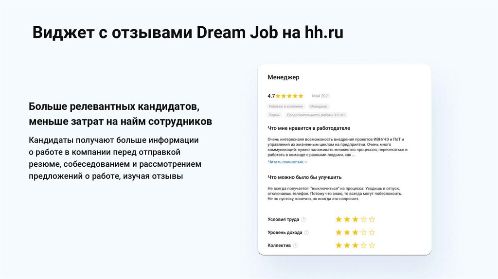 Виджет с отзывами Dream Job на hh.ruБольше релевантных кандидатов,