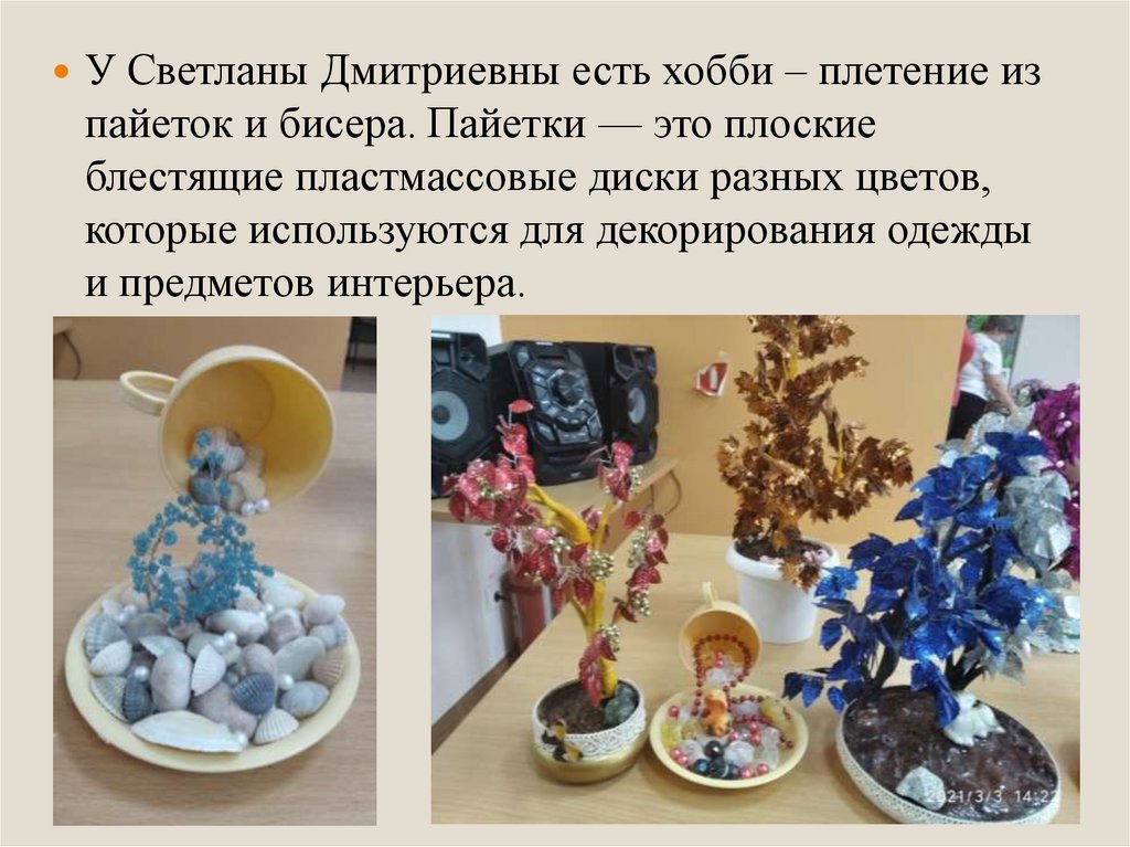 У Светланы Дмитриевны есть хобби – плетение изпайеток и бисера. Пайетки — это плоские