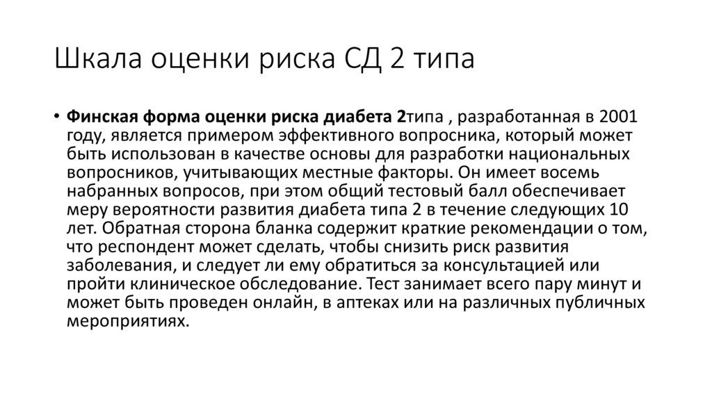 Шкала оценки риска СД 2 типа• Финская форма оценки риска диабета 2типа , разработанная в 2001