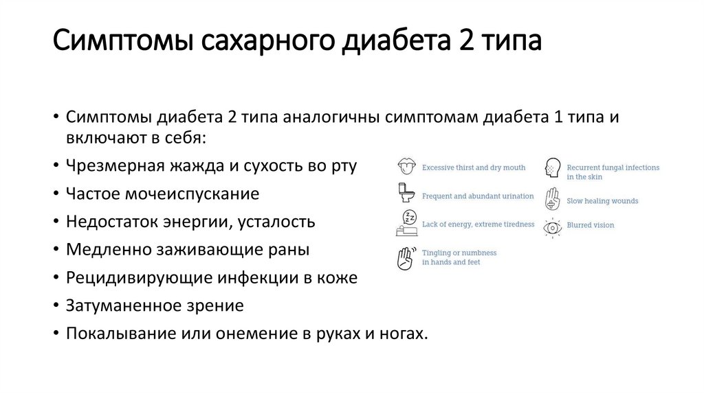 Симптомы сахарного диабета 2 типа• Симптомы диабета 2 типа аналогичны симптомам диабета 1 типа и