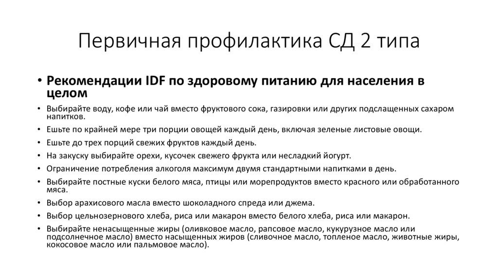 Первичная профилактика СД 2 типа• Рекомендации IDF по здоровому питанию для населения в