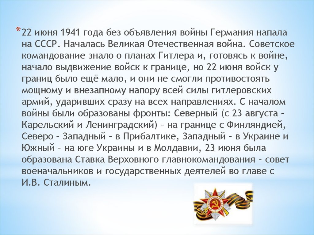 * 22 июня 1941 года без объявления войны Германия напалана СССР. Началась Великая Отечественная война. Советское
