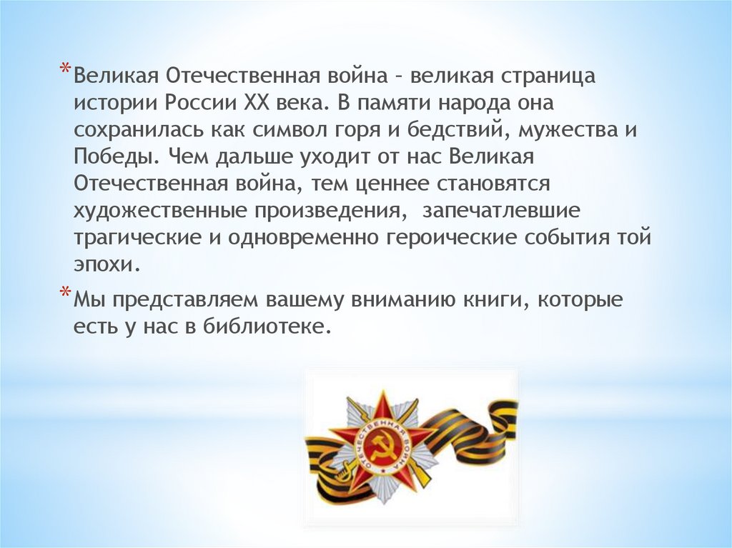 * Великая Отечественная война – великая страницаистории России XX века. В памяти народа она
