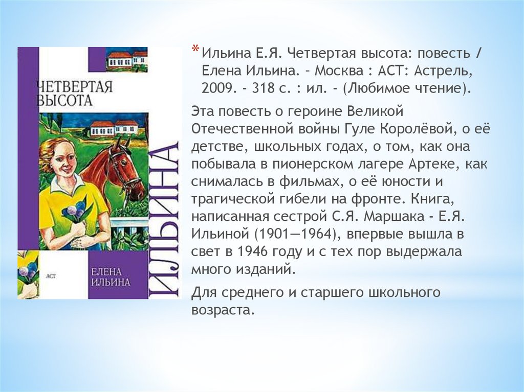 * Ильина Е.Я. Четвертая высота: повесть /Елена Ильина. – Москва : АСТ: Астрель,