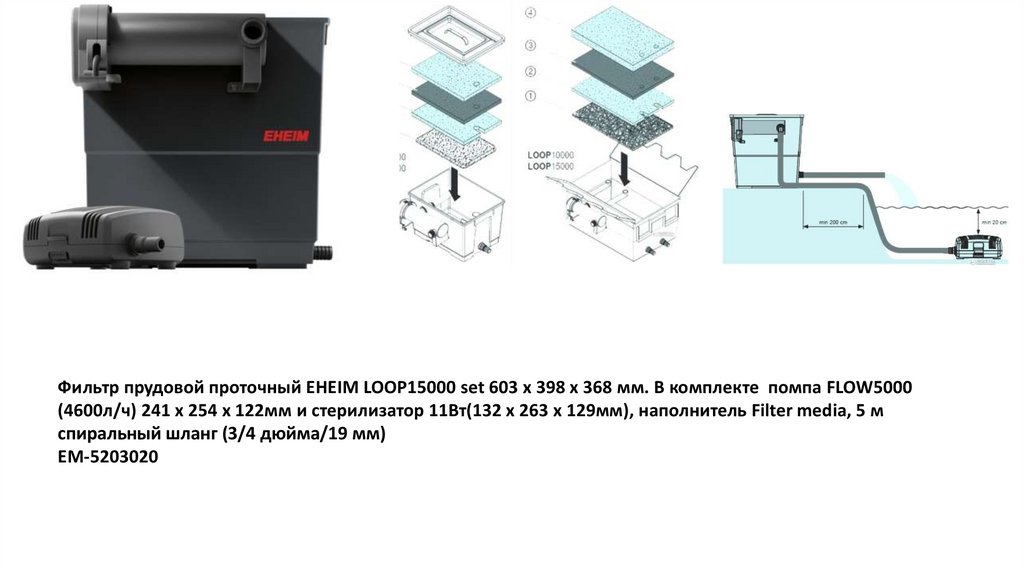 Фильтр прудовой проточный EHEIM LOOP15000 set 603 x 398 x 368 мм. В комплекте помпа FLOW5000(4600л/ч) 241 x 254 x 122мм и стерилизатор 11Вт(132 x 263 x 129мм), наполнитель Filter media, 5 м