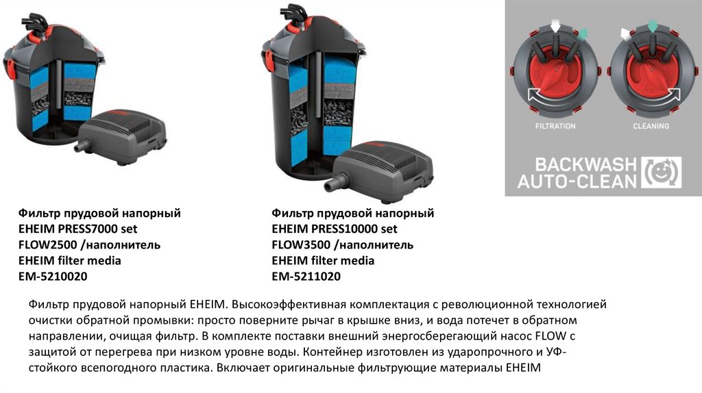 защитой от перегрева при низком уровне воды. Контейнер изготовлен из ударопрочного и УФстойкого всепогодного пластика. Включает оригинальные фильтрующие материалы EHEIM