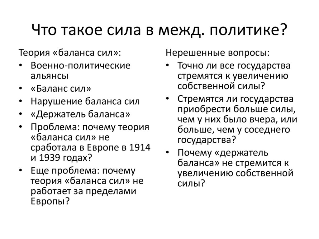 Что такое сила в межд. политике?Теория «баланса сил»: