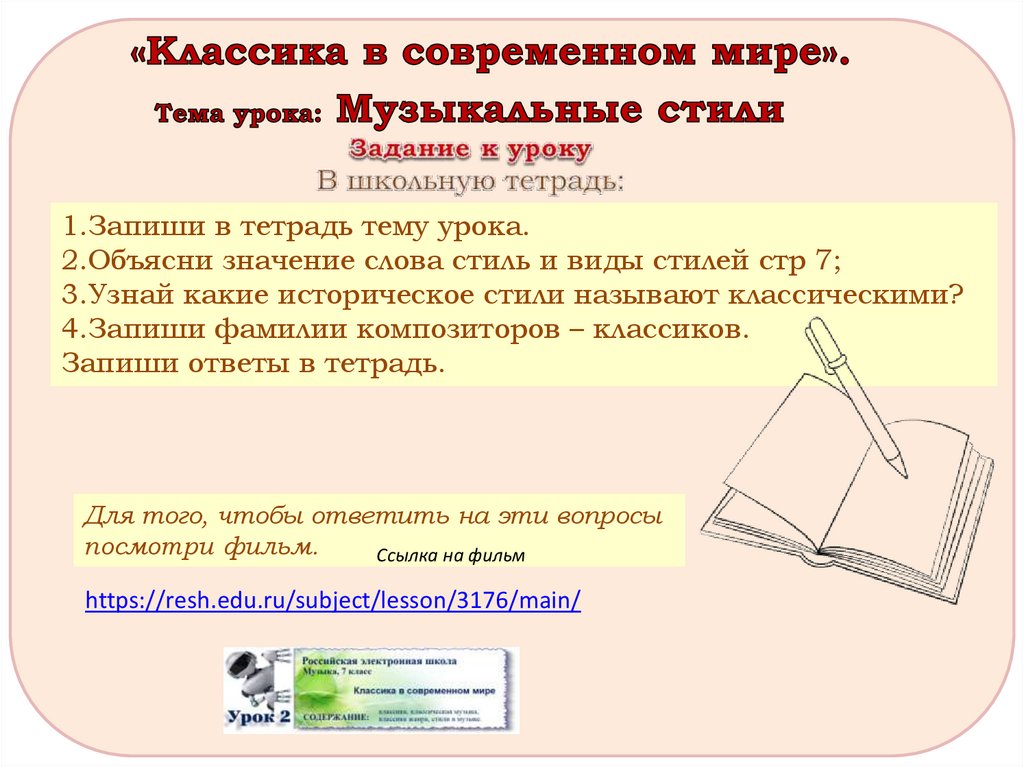 1.Запиши в тетрадь тему урока.2.Объясни значение слова стиль и виды стилей стр 7;