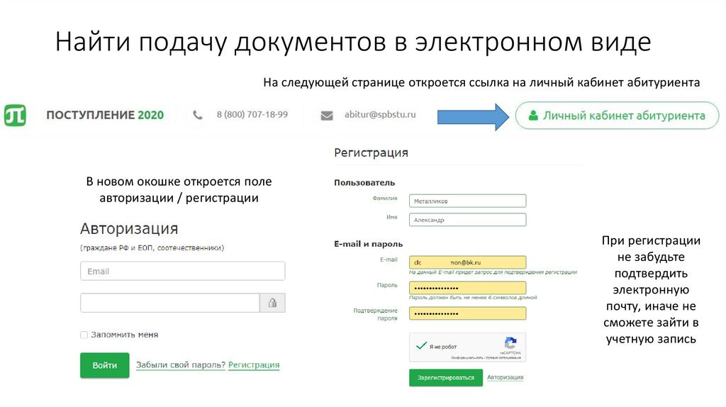 Найти подачу документов в электронном видеНа следующей странице откроется ссылка на личный кабинет абитуриента