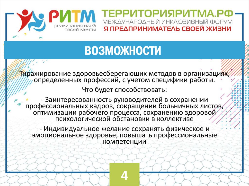 ВОЗМОЖНОСТИТиражирование здоровьесберегающих методов в организациях,