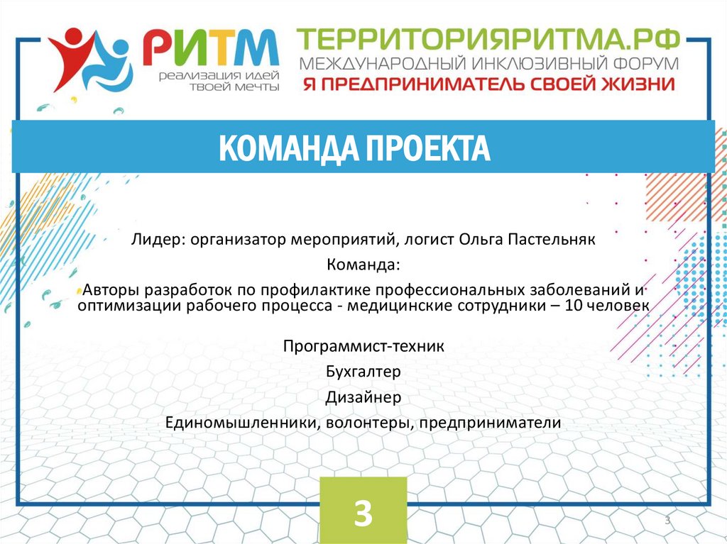 КОМАНДА ПРОЕКТАЛидер: организатор мероприятий, логист Ольга Пастельняк
