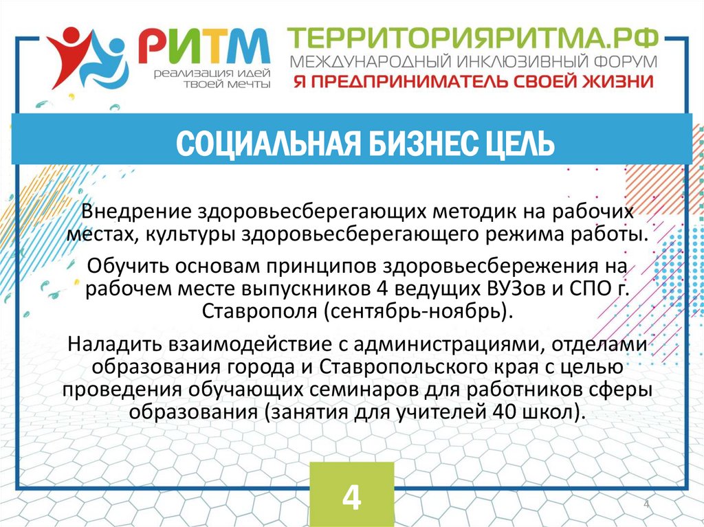 СОЦИАЛЬНАЯ БИЗНЕС ЦЕЛЬВнедрение здоровьесберегающих методик на рабочих