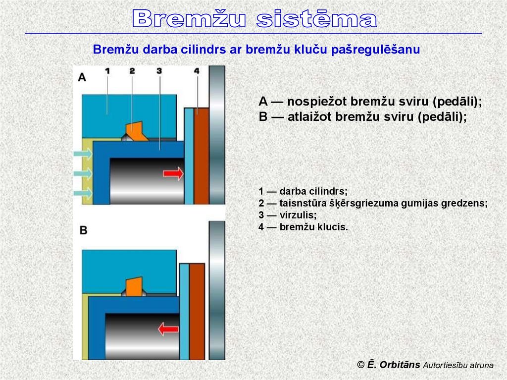 Bremžu darba cilindrs ar bremžu kluču pašregulēšanuA — nospiežot bremžu sviru (pedāli);