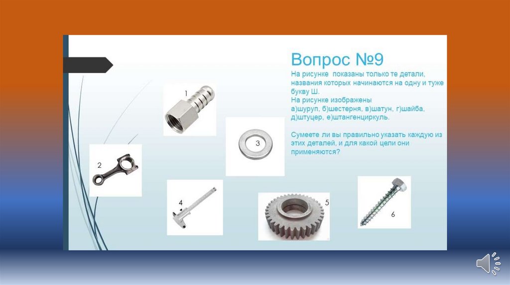 12 – й слайд – 1 штуцер,2 шатун, 3 шайба, 4 штангенциркуль, 5 шестерня, 6 шуруп