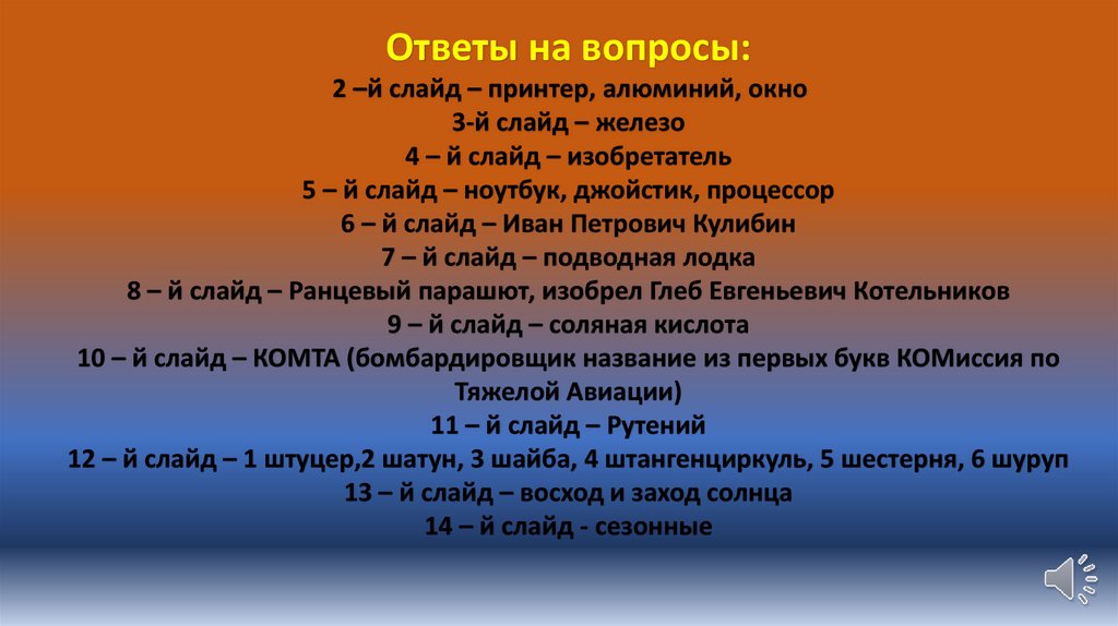 Ответы на вопросы:2 –й слайд – принтер, алюминий, окно