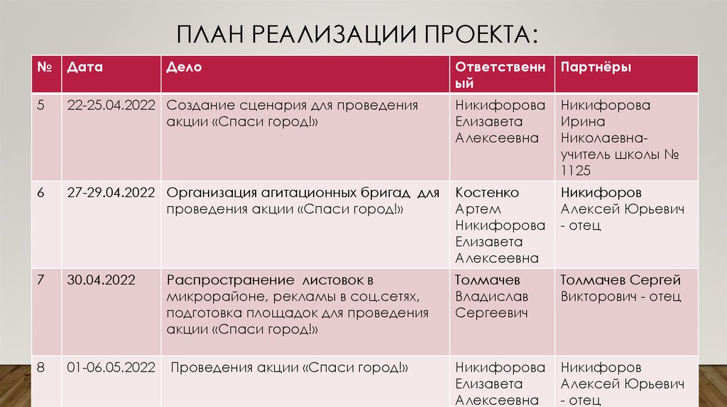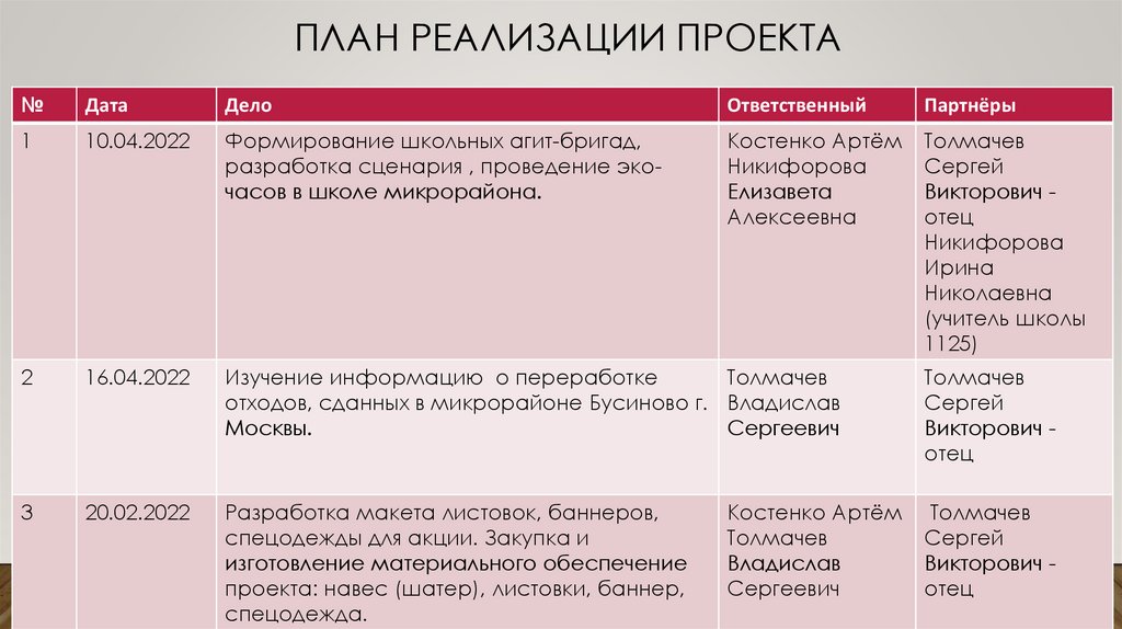 ПЛАН РЕАЛИЗАЦИИ ПРОЕКТА:№