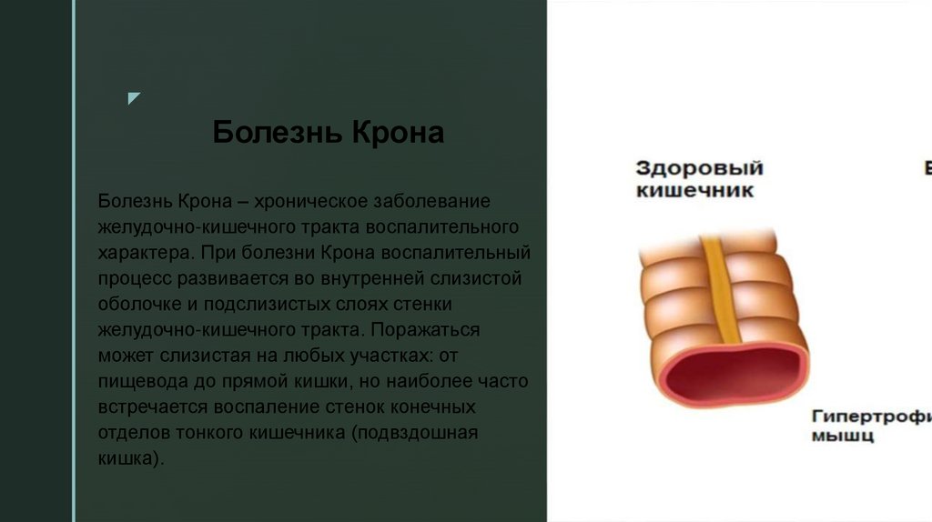 пищеварения и симптоматической терапии. Основная группа препаратов – противовоспалительные средства. При болезни Крона применяют 5аминосалицилаты (сульфазалин, месазалин) и препараты группы кортикостероидных гормонов (преднизолон, гидрокортизон). Кортикостероидные
