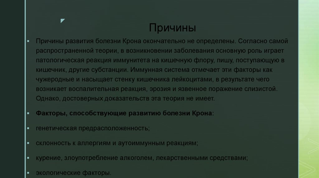 Причины развития болезни Крона окончательно не определены. Согласно самой