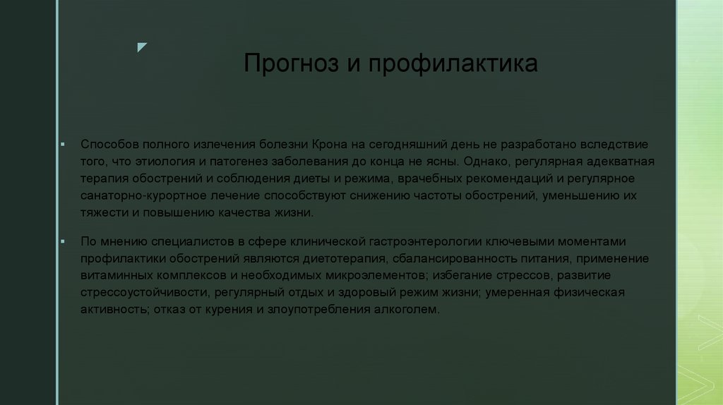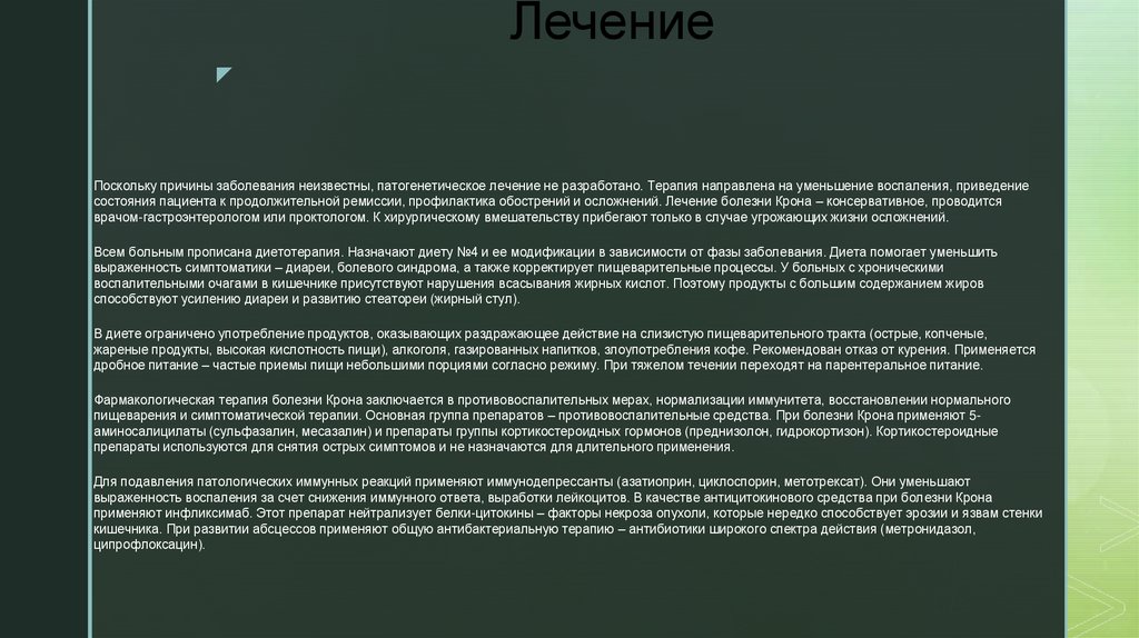 состояния пациента к продолжительной ремиссии, профилактика обострений и осложнений. Лечение болезни Крона – консервативное, проводится