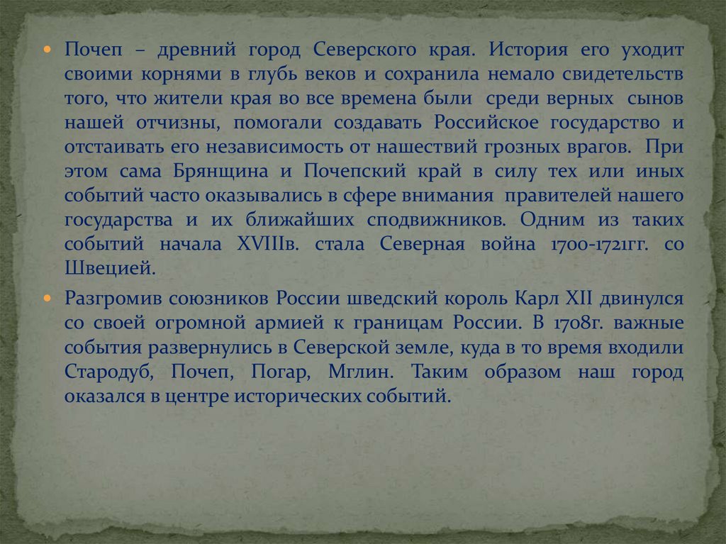Почеп – древний город Северского края. История его уходитсвоими корнями в глубь веков и сохранила немало свидетельств