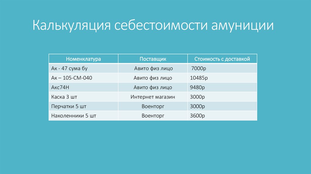 Калькуляция себестоимости амуниции