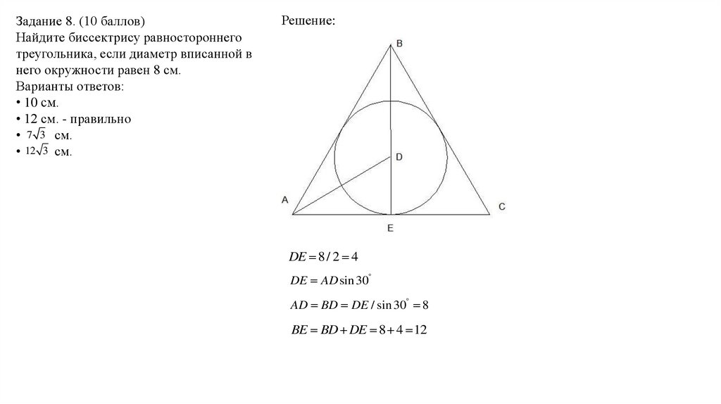 Задание 8. (10 баллов)Найдите биссектрису равностороннего