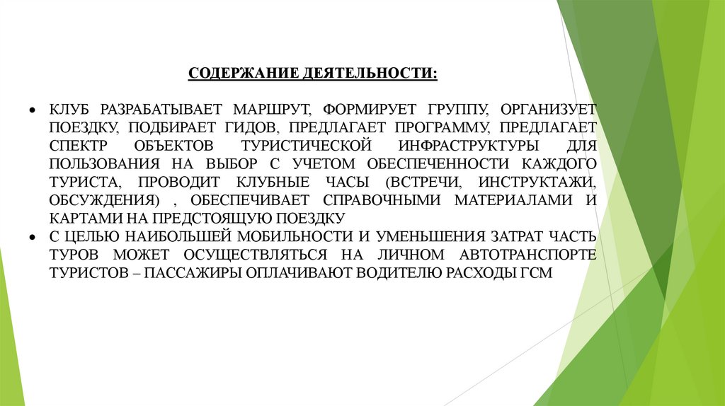 СОДЕРЖАНИЕ ДЕЯТЕЛЬНОСТИ:КЛУБ РАЗРАБАТЫВАЕТ МАРШРУТ, ФОРМИРУЕТ ГРУППУ, ОРГАНИЗУЕТ