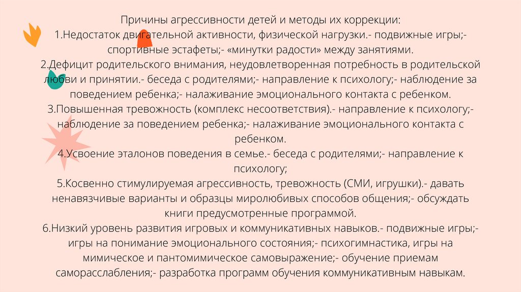 Причины агрессивности детей и методы их коррекции:1.Недостаток двигательной активности, физической нагрузки.- подвижные игры;спортивные эстафеты;- «минутки радости» между занятиями.