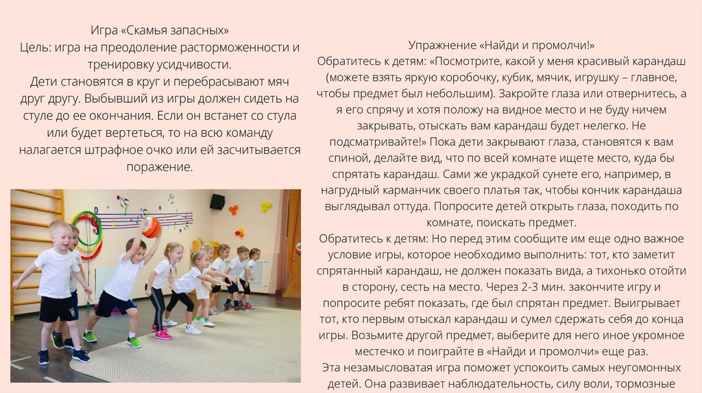 дети становятся в круг, по команде преподавателя начинают передавать мяч по круги, при этом называя человека, которому передадут мяч, какилибо словом (заранее обговаривайте условие, какими обзывалками можно пользоваться. Это могут быть названия овощей, фруктов, грибов или