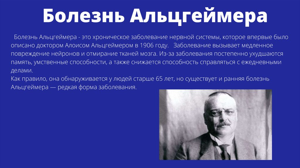 описано доктором Алоисом Альцгеймером в 1906 году. Заболевание вызывает медленное
