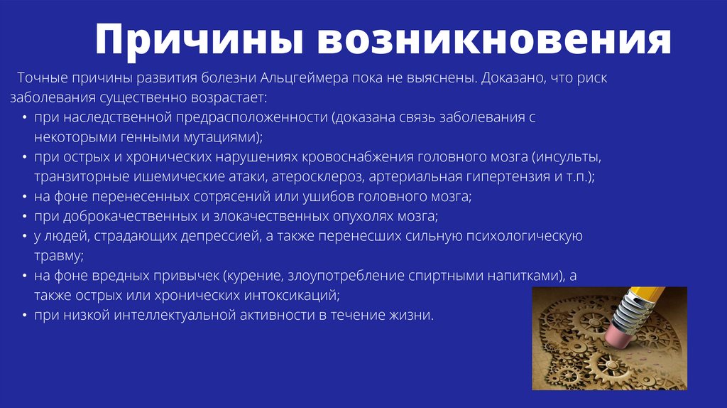 Причины возникновенияТочные причины развития болезни Альцгеймера пока не выяснены. Доказано, что риск