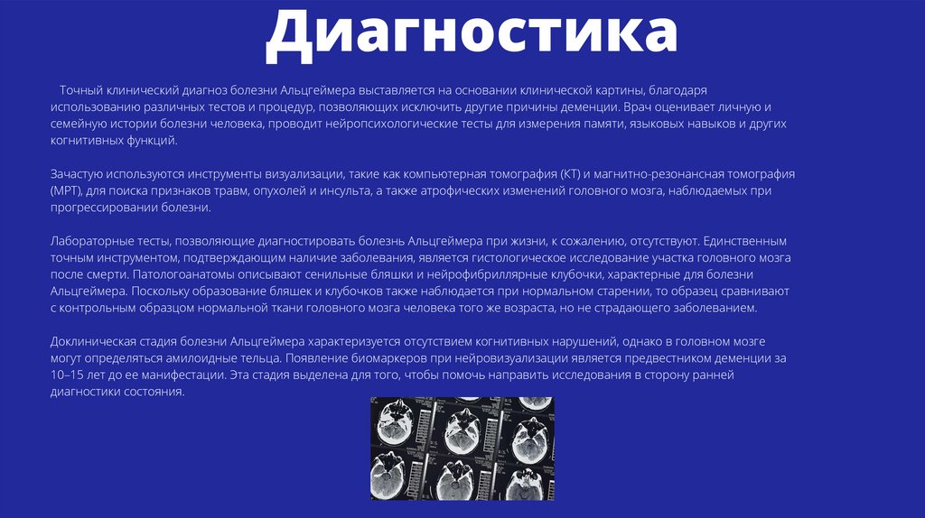 ДиагностикаТочный клинический диагноз болезни Альцгеймера выставляется на основании клинической картины, благодаря
