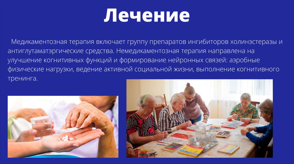ЛечениеМедикаментозная терапия включает группу препаратов ингибиторов холинэстеразы и