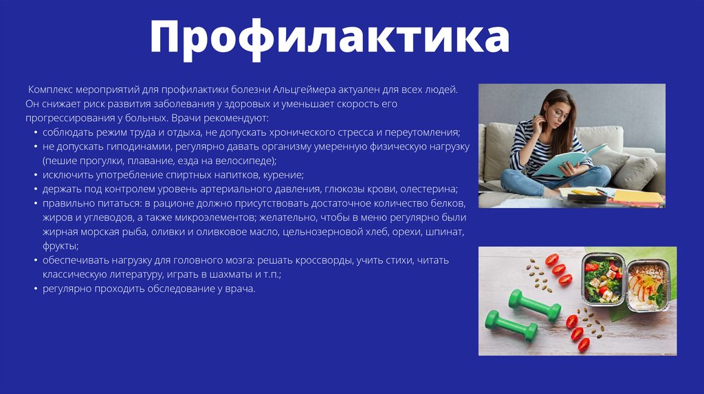 ПрофилактикаКомплекс мероприятий для профилактики болезни Альцгеймера актуален для всех людей.