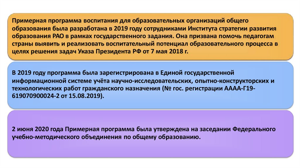 Примерная программа воспитания для образовательных организаций общегообразования была разработана в 2019 году сотрудниками Института стратегии развития