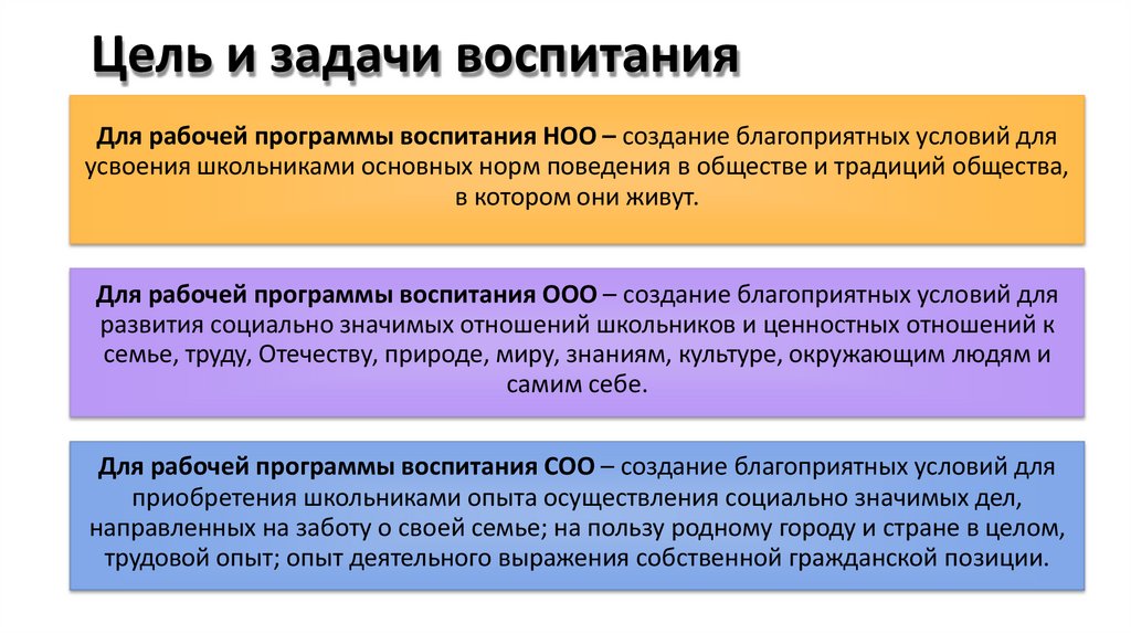 Цель и задачи воспитанияДля рабочей программы воспитания НОО – создание благоприятных условий для