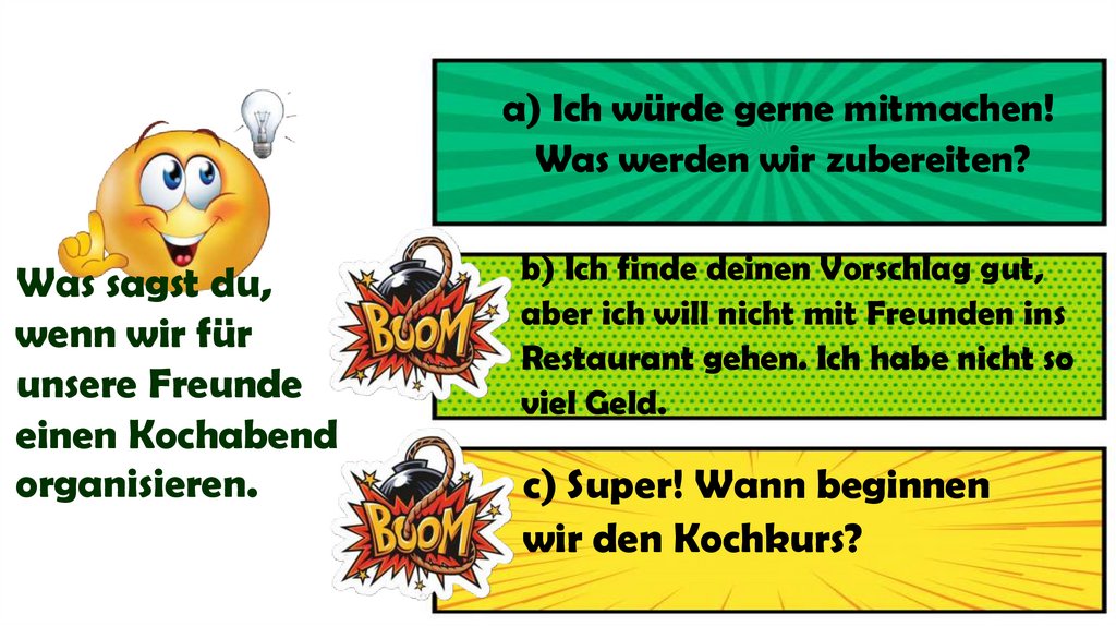 a) Ich würde gerne mitmachen!Was werden wir zubereiten?