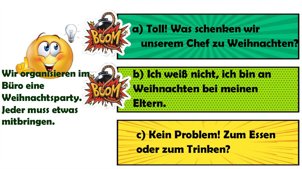 a) Toll! Was schenken wirunserem Chef zu Weihnachten?