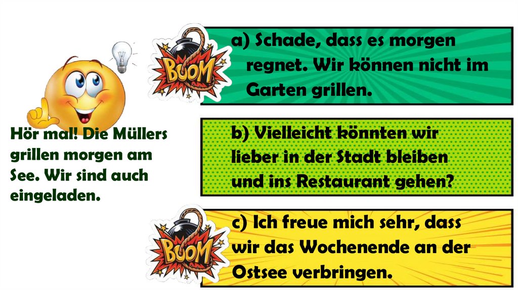 a) Schade, dass es morgenregnet. Wir können nicht im
