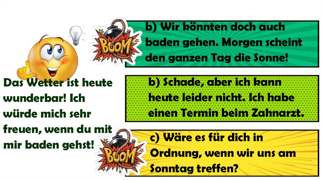 b) Wir könnten doch auchbaden gehen. Morgen scheint