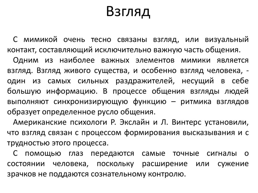 ВзглядС мимикой очень тесно связаны взгляд, или визуальный